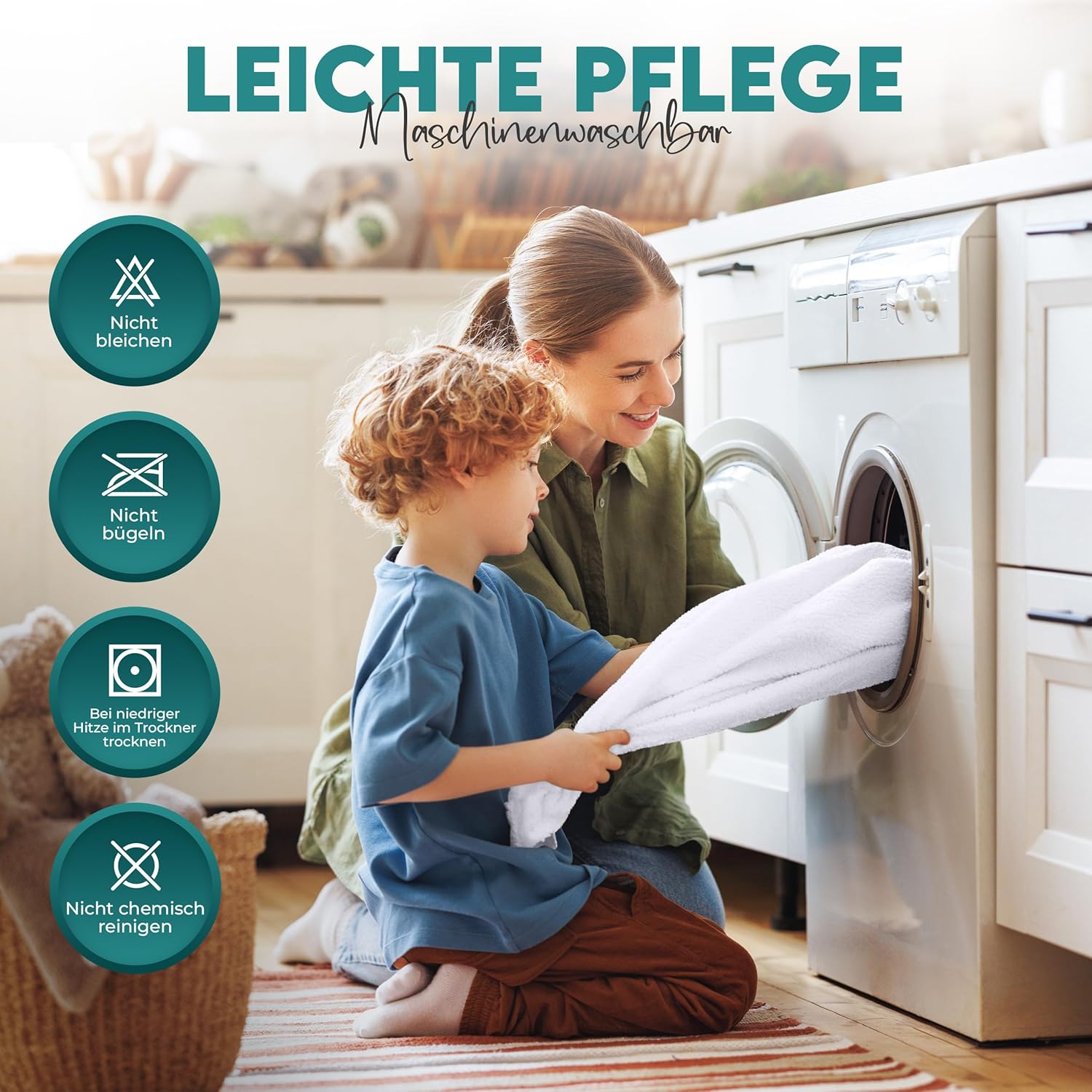 Details: Bei Allergien/Schweiß häufiger. Immer separat oder mit ähnlichen Textilien waschen.